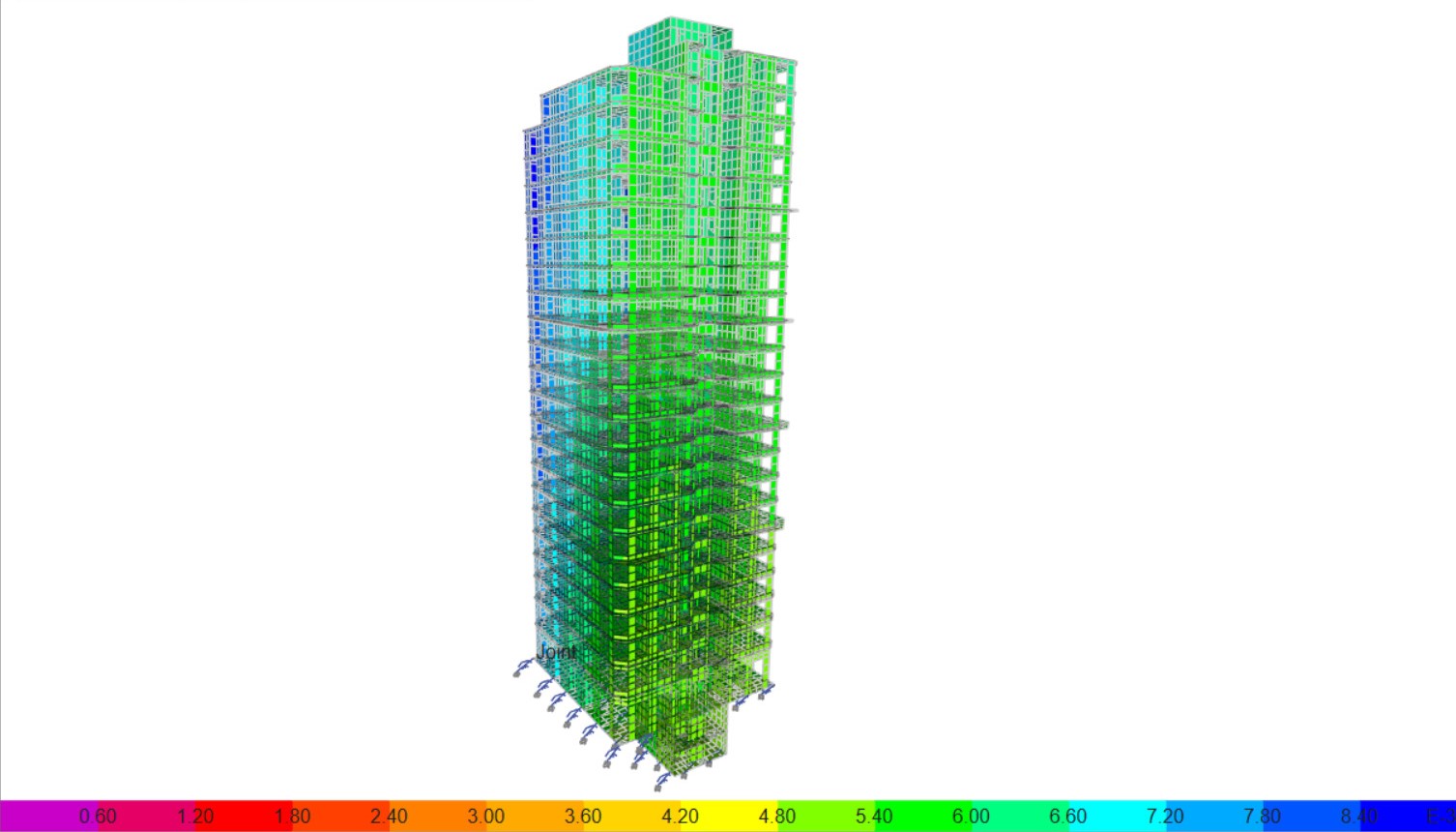 В рамках проекта «Алматы – Метрополь 2» были разработаны и использованы подробные FEM-модели для анализа сейсмостойкости здания.